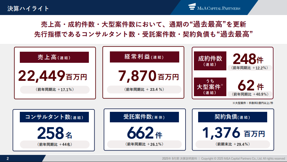 2025年9月期 通期では、売上高224.4億円(前年同期比+17.1%)、経常利益78.7億円(+23.4%)を計上し、過去最高を更新。成約件数は248件(+12.7%)、うち大型案件(手数料1億円以上)は62を記録し、売上・利益・案件数すべてで過去最高を達成しました。