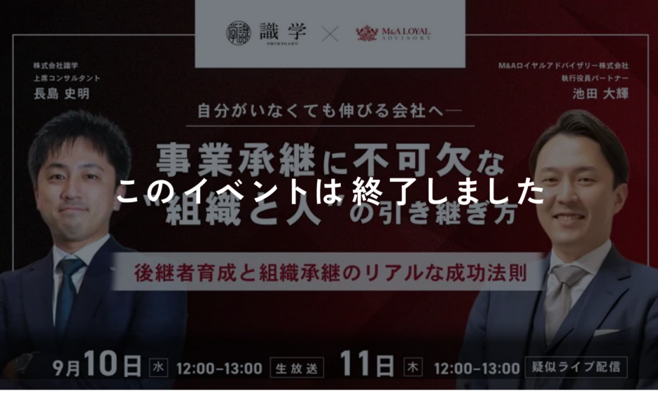 今回は、M&Aロイヤルアドバイザリーの現役アドバイザーと、組織マネジメントに強みを持つ識学のコンサルタントが登壇します。