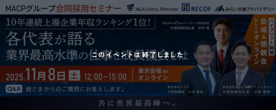 ※終了しました【11/8開催】M&Aキャピタルパートナーズグループ 合同採用セミナー/座談会|グループ3社代表登壇+少人数制交流会【会場 or オンライン】